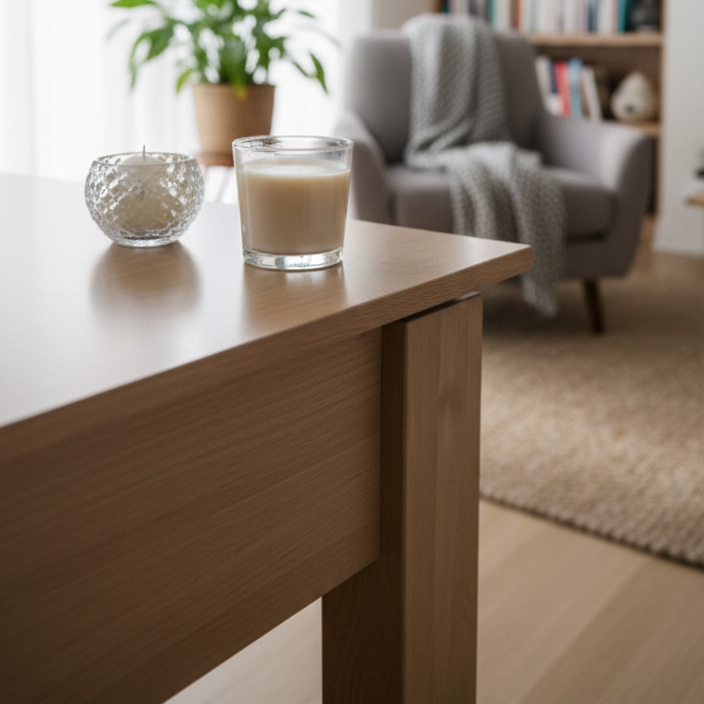 Mesa ratona Wine de 1,00 m de frente, 0,60 m de profundidad y 0,45 m de altura, con sistema de guías telescópicas que permite deslizar la tapa y acceder a su espacio interior de guardado.